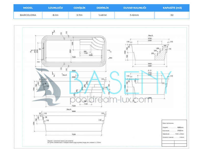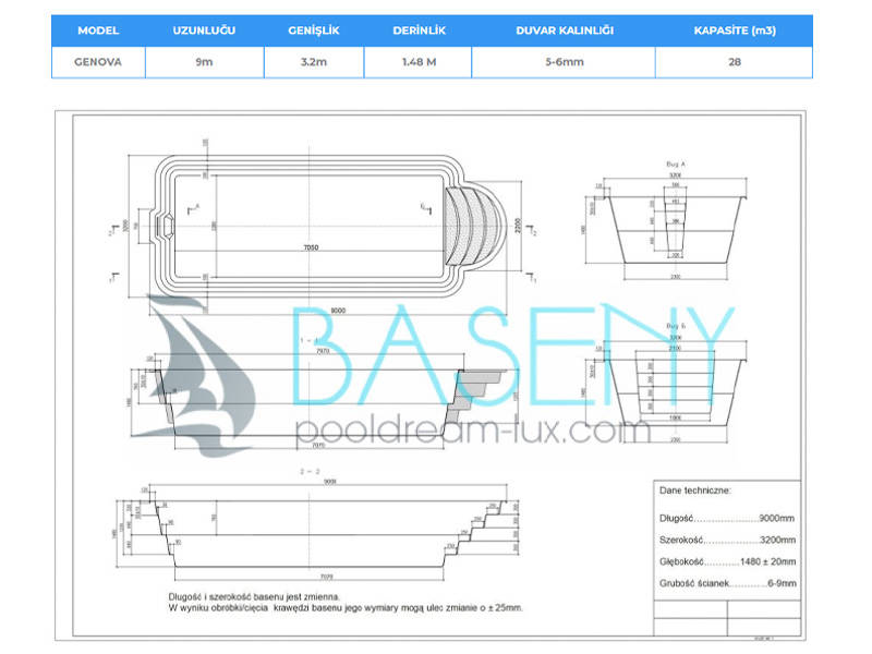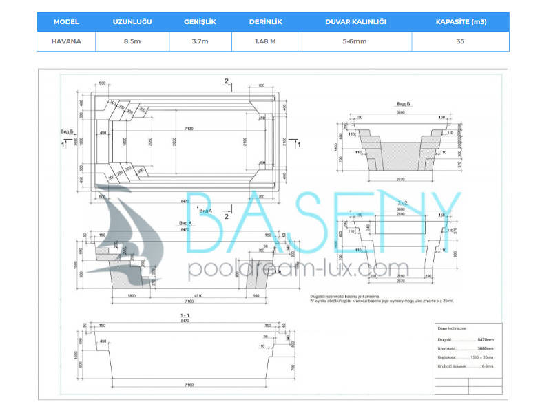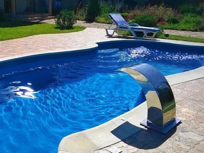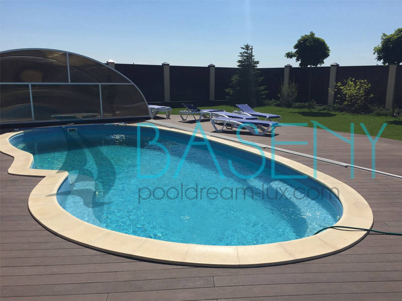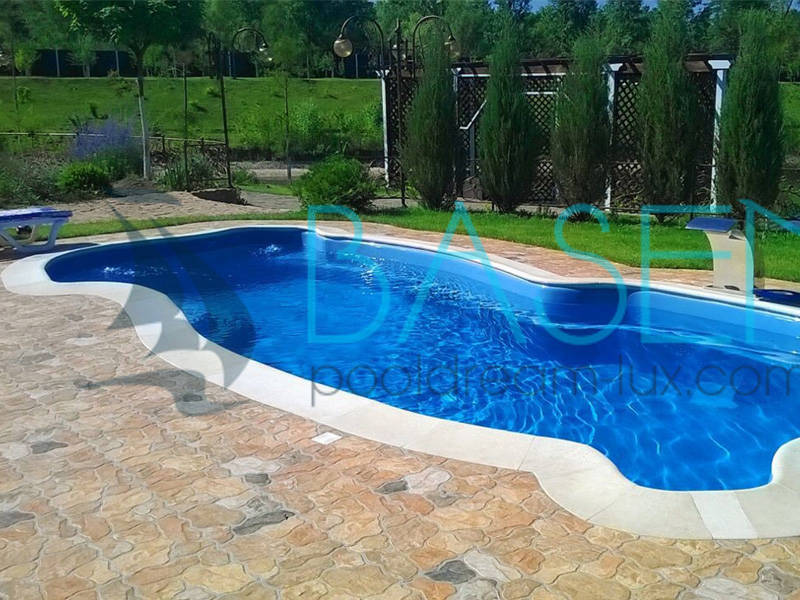Eğimli bir taban ile karakterize edilen 3 modelimiz (derinlik farkı yaklaşık 40 cm'dir). Oturma yerlerinin olduğu ilginç bir şekil. Önde gelen modellerden biri, kendine özgü bir böbrek şeklinde 7.5 metrelik havuz.
