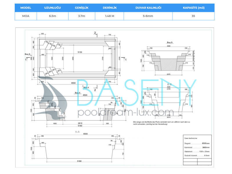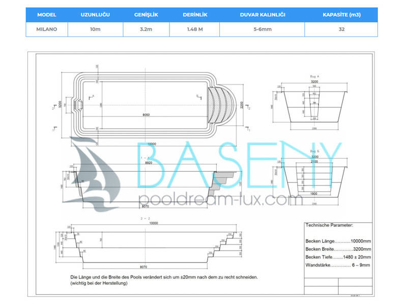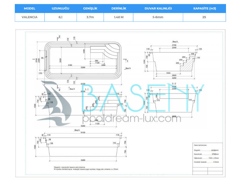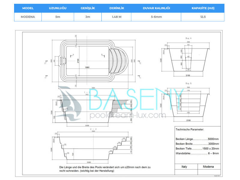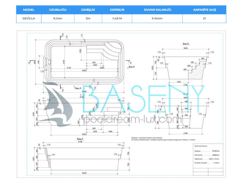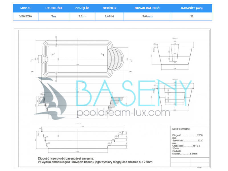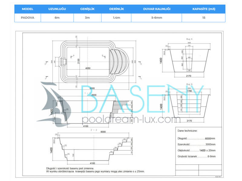 Eğimli bir taban ile karakterize edilen 3 modelimiz (derinlik farkı yaklaşık 40 cm'dir). Oturma yerlerinin olduğu ilginç bir şekil. Önde gelen modellerden biri, kendine özgü bir böbrek şeklinde 7.5 metrelik havuz.